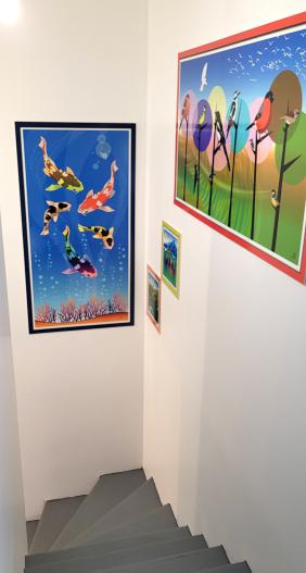 Série de tableaux naifs pour colorer une montée d'escaliers.